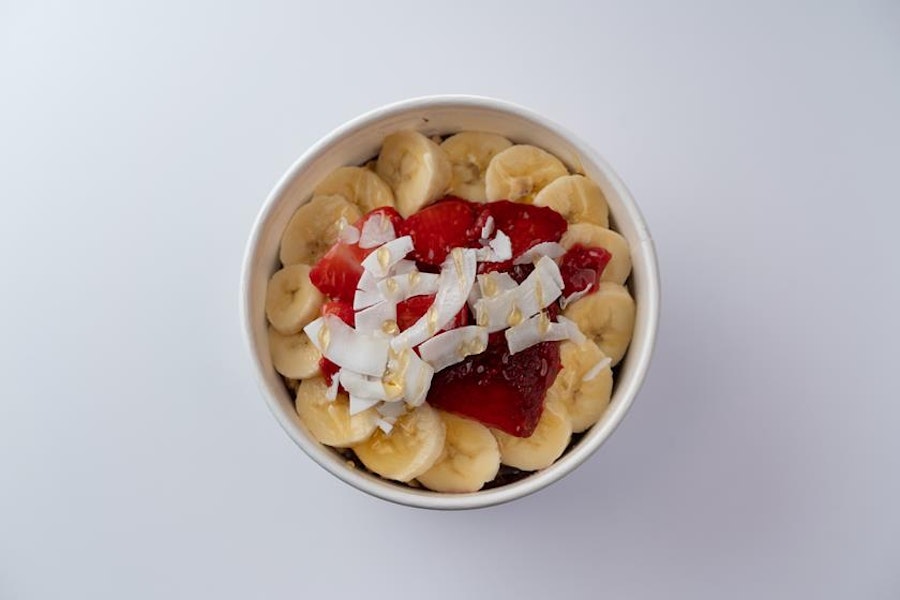 Organic açaí berries blended with apple juice, coconut milk, banana, mango, pineapple, and flaxseeds. Topped with organic gluten-free granola, bananas, strawberries, coconut shavings, and honey