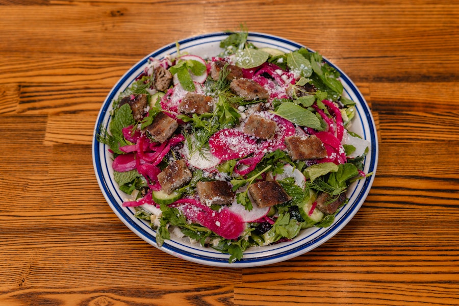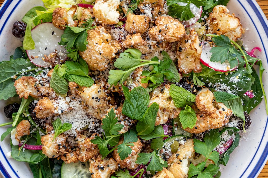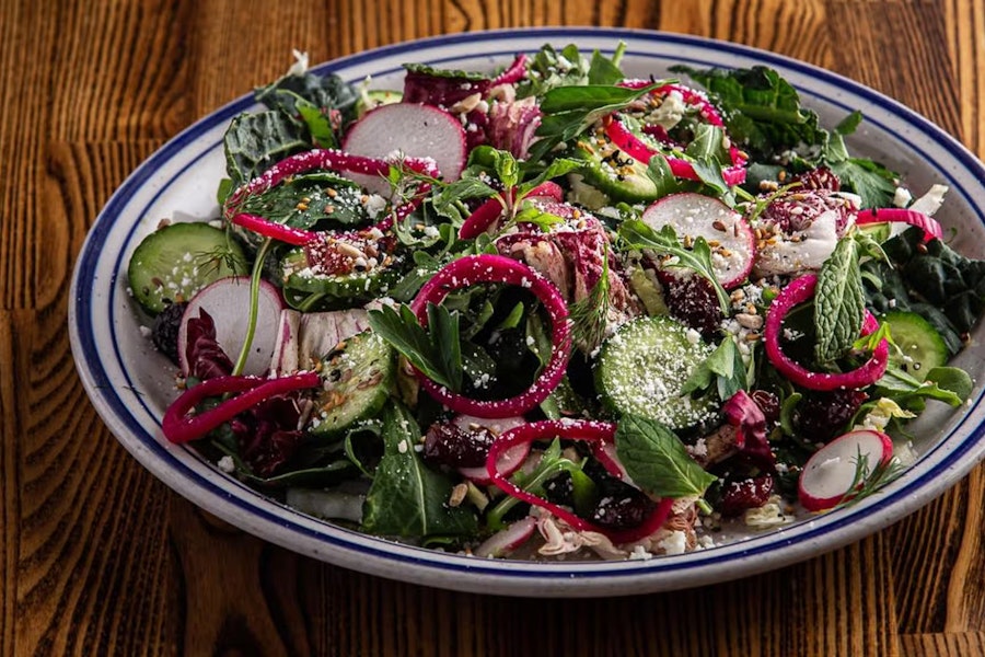 Mixed greens, pickled onions, seeds (sesame, pumpkin, sunflower, flax), dried cherries, cucumbers, radish, cotija, herbs (mint, dill, parsley), lemon sesame vinaigrette (contains soy sauce)