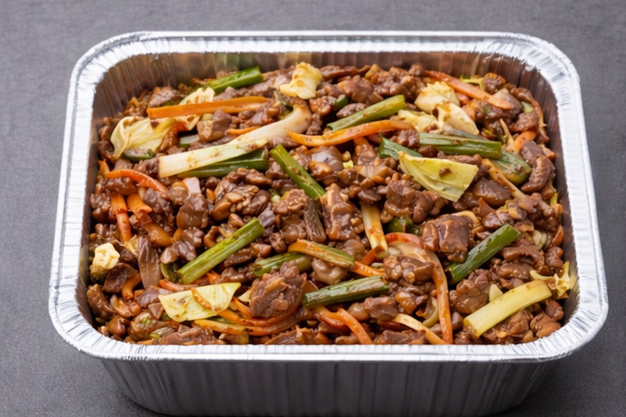 Beef, onion, bell pepper, and bold black pepper sauce