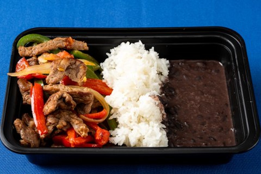 With white rice and black beans. Flour tortilla served on the side (not gluten-free)