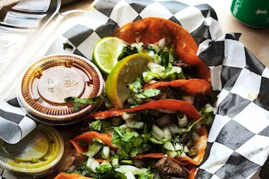 Three pork tacos on corn tortillas, marinated in red pastor sauce, cilantro, onions, side of lime & salsa verde