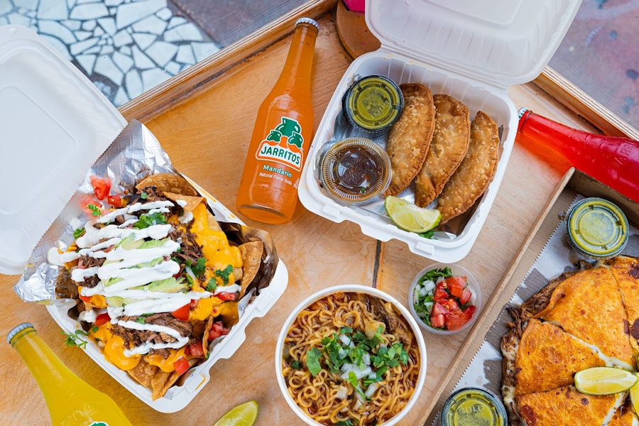 Rice, pinto beans, shredded brisket, cheese, pico de gallo, avocado & sour cream. Served with birria broth, tortilla chips & salsa verde