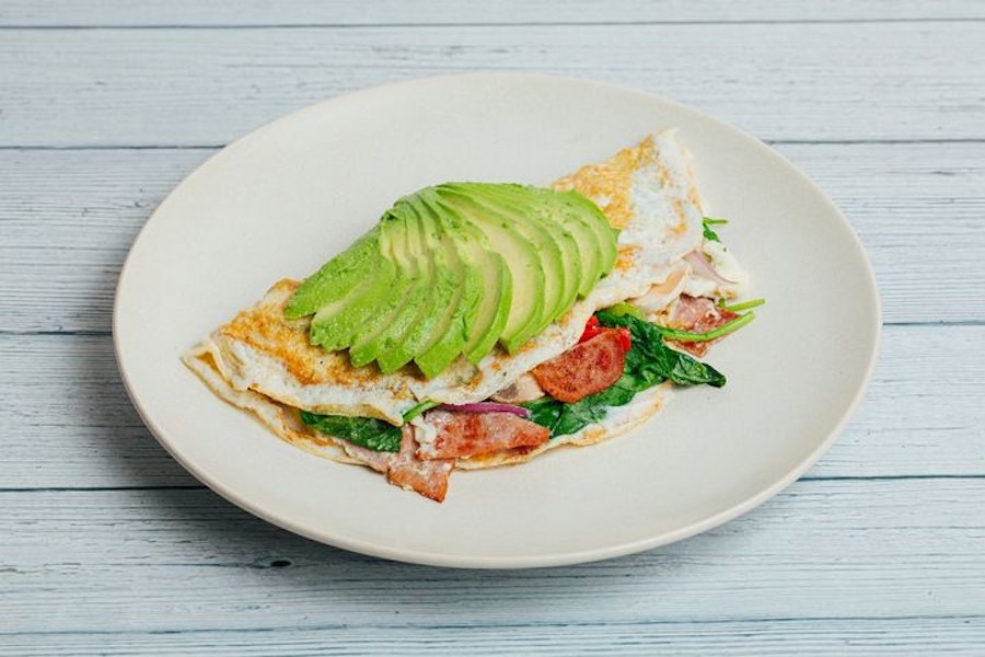 Served with our spicy cilantro salsa. Egg white omelette stuffed with turkey bacon, red onions, mushrooms, spinach, and topped with avocado
