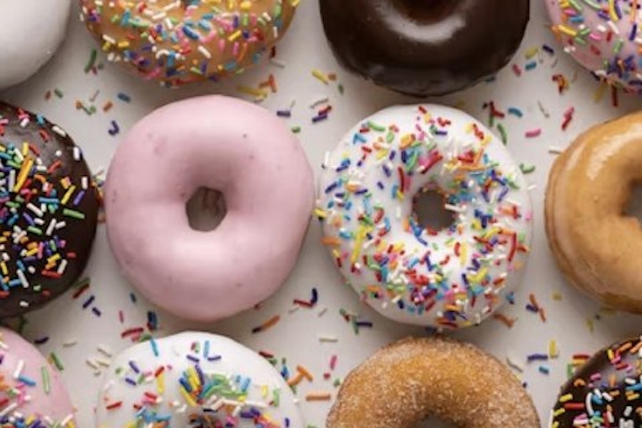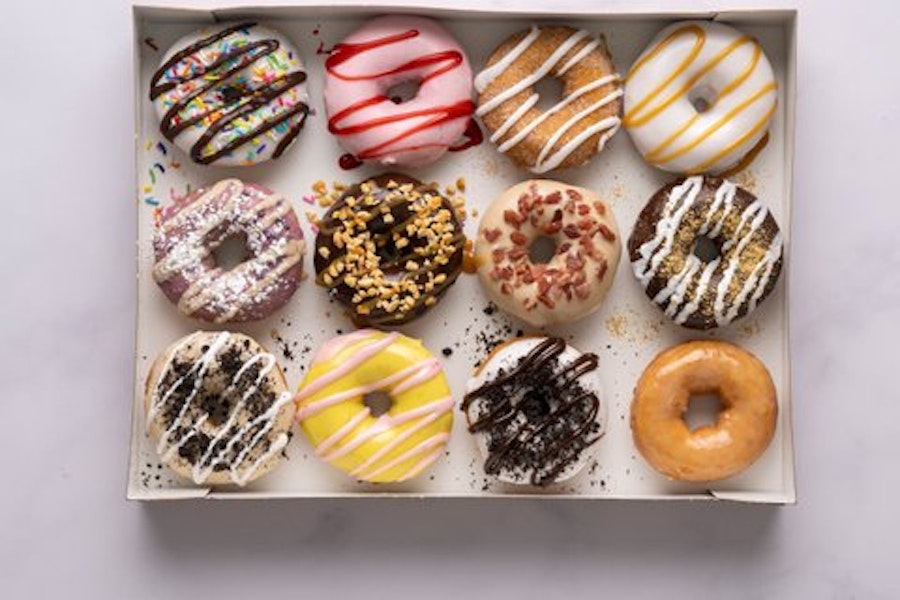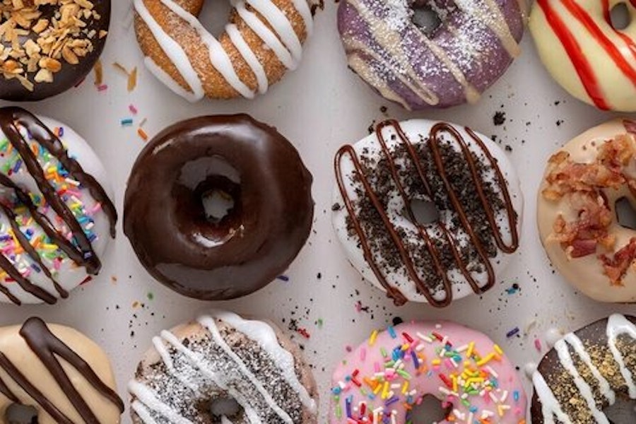 Includes french toast donut (maple icing with cinnamon sugar & powdered sugar), blueberry pancake donut (blueberry icing with maple drizzle & powdered sugar), maple bacon donut (maple icing with chopped bacon), bacon in the sun donut (maple icing with chopped bacon & salted caramel drizzle), cinnamon bun donut (cinnamon sugar with vanilla drizzle), chocolate-covered strawberry donut (strawberry icing with chocolate drizzle), coffee cake donut (glazed with streusel & powdered sugar), cookies & cream donut (vanilla icing with oreo cookie pieces & hot fudge drizzle), cinnamon sugar donut, peanut butter iced donut (with marshmallow drizzle), blueberry iced donut (with streusel), and glazed donut
