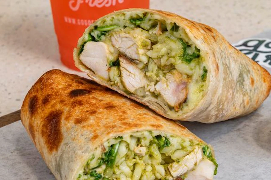 A gluten-free tortilla wrapped around tender antibiotic-free chicken, melty mozzarella, our house-made basil pesto, and baby arugula