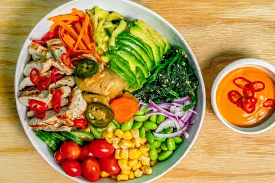 Seasoned chicken with spicy mayo, kimchi (contains fish sauce & salted shrimp), carrots, cucumber, squash, mushroom, corn & edamame