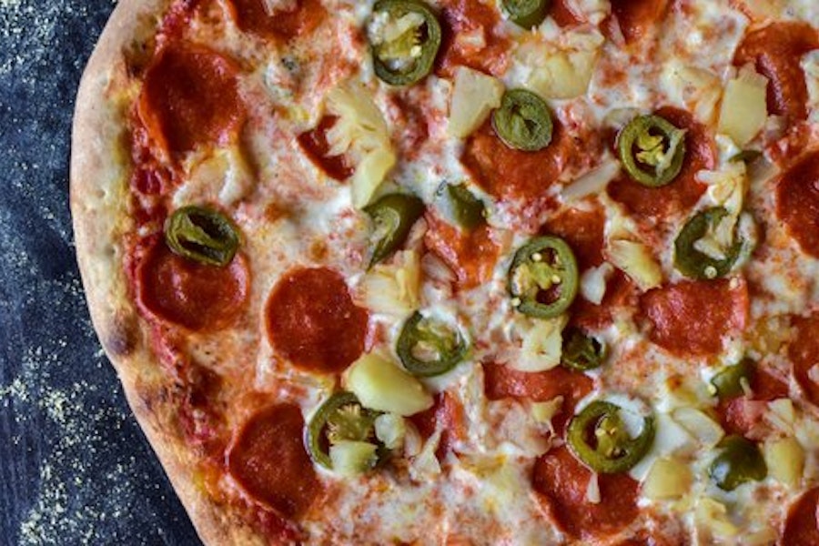 With jalapenos, pepperoni, and pineapple