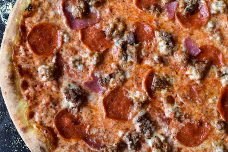 With pepperoni, bacon, and sausage