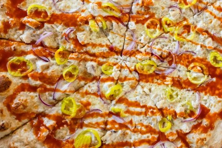 With garlic onion spread, roasted chicken, banana pepper, onion, and buffalo sauce
