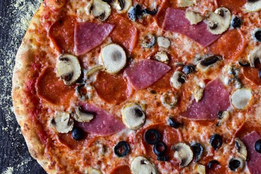 With pepperoni, genoa salami, mushrooms, and black olives