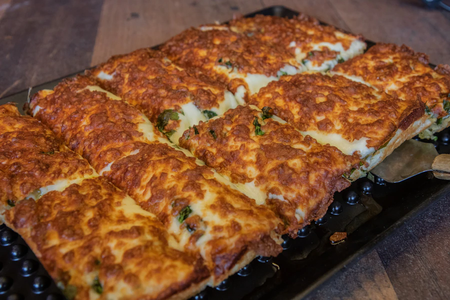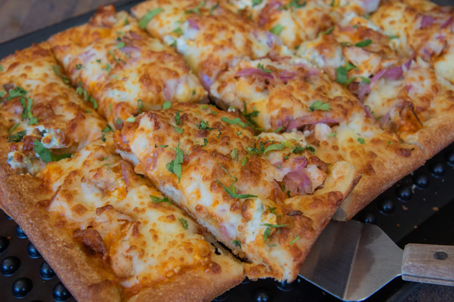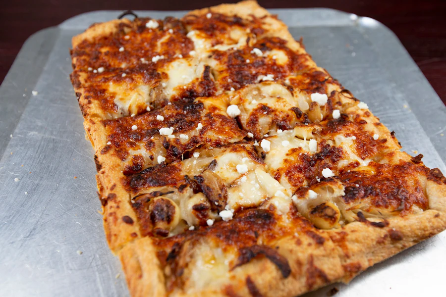 Buffalo sauce, smoked chicken, blue cheese crumbles & marinated onions