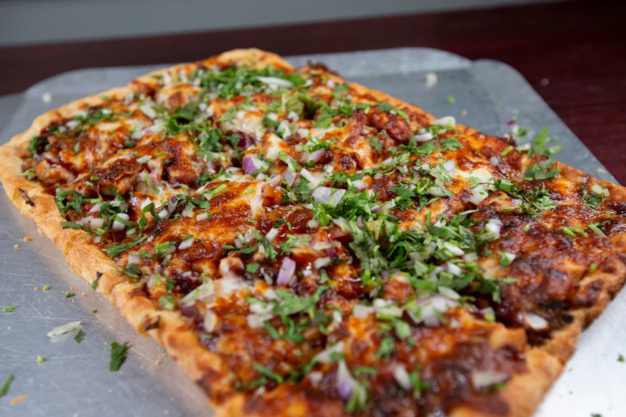 Tangy bbq sauce, chicken, red onions, mozzarella & cilantro