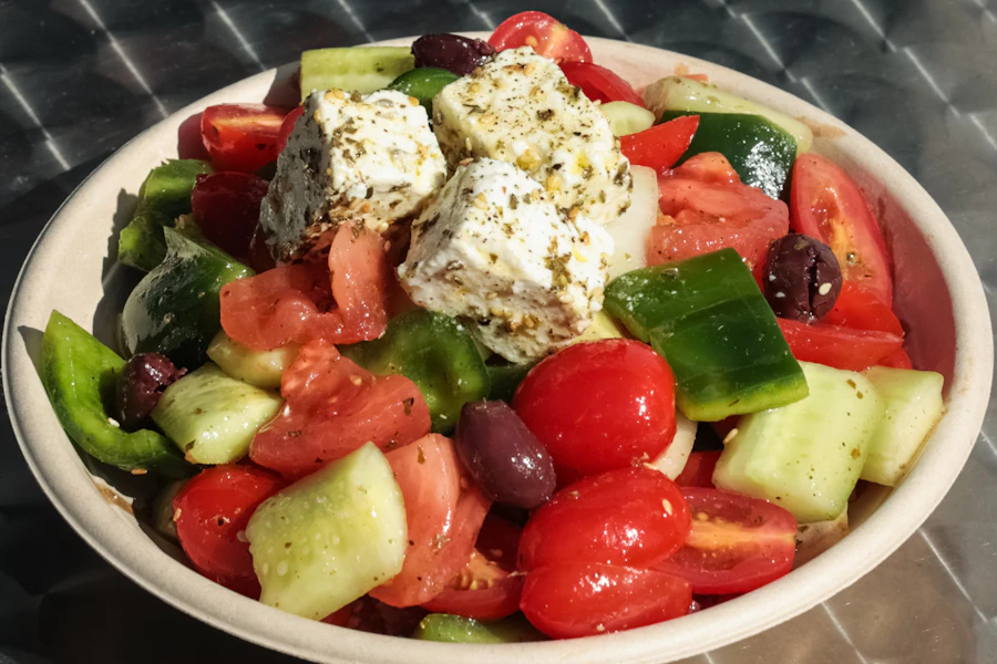 Traditional greek salad with tomatoes, cucumber, green pepper, white onion, kalamata olives, premium pdo feta, olive oil, oregano, sesame, and a splash of acid