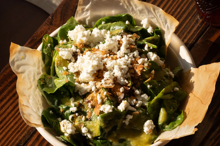 Spinach, herbs, crumbled pdo feta, signature green vinaigrette on a nest of phyllo