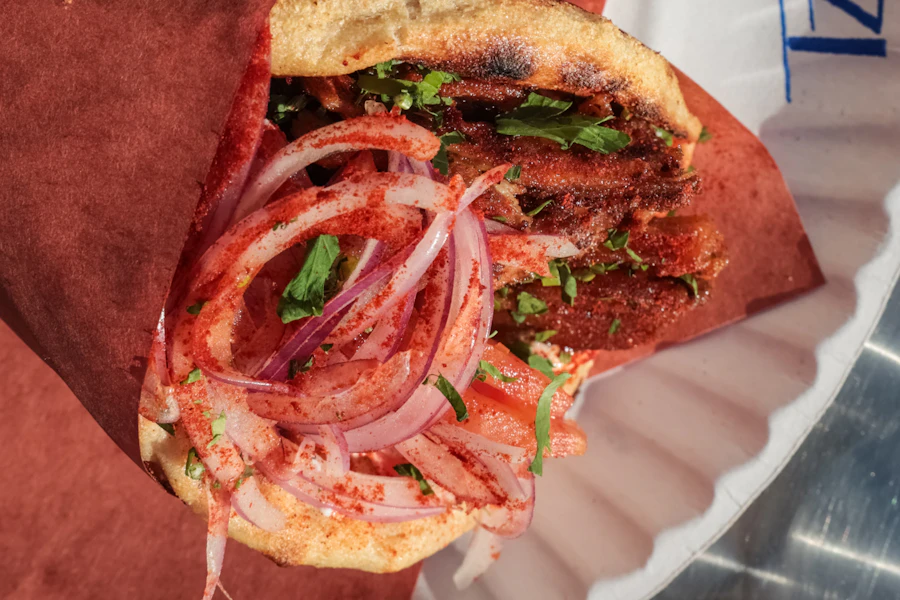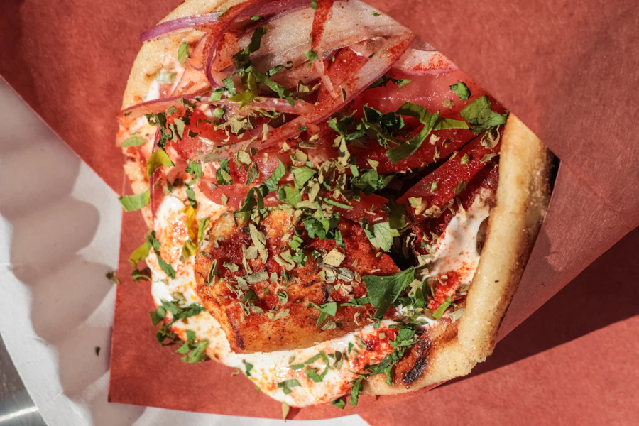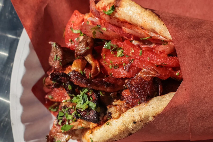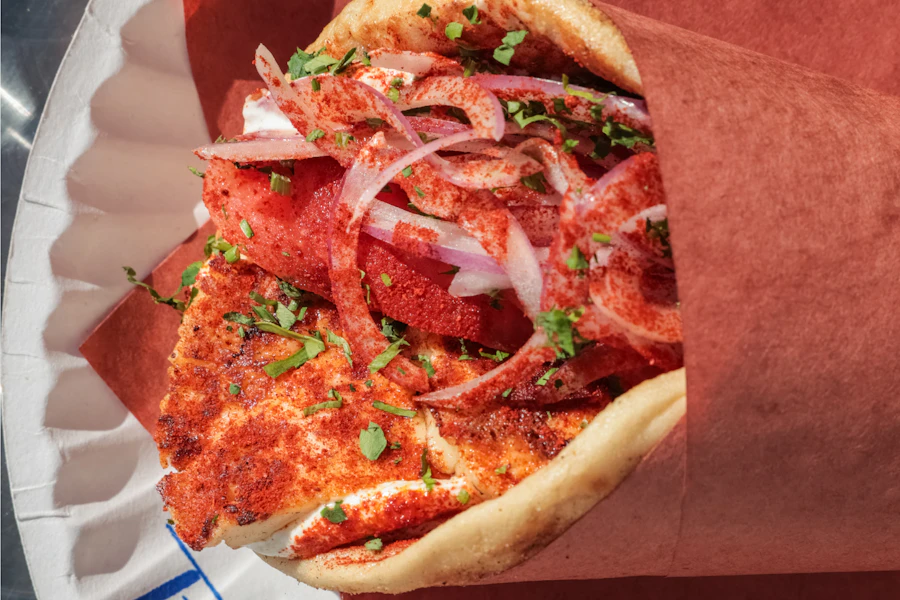 Freshly ground beef mixed with a blend of herbs and spices, grilled on a flat metal skewer. Topped on a handmade greek pita with peeled tomatoes, sliced red onions, parsley, greek yogurt, and smoked paprika