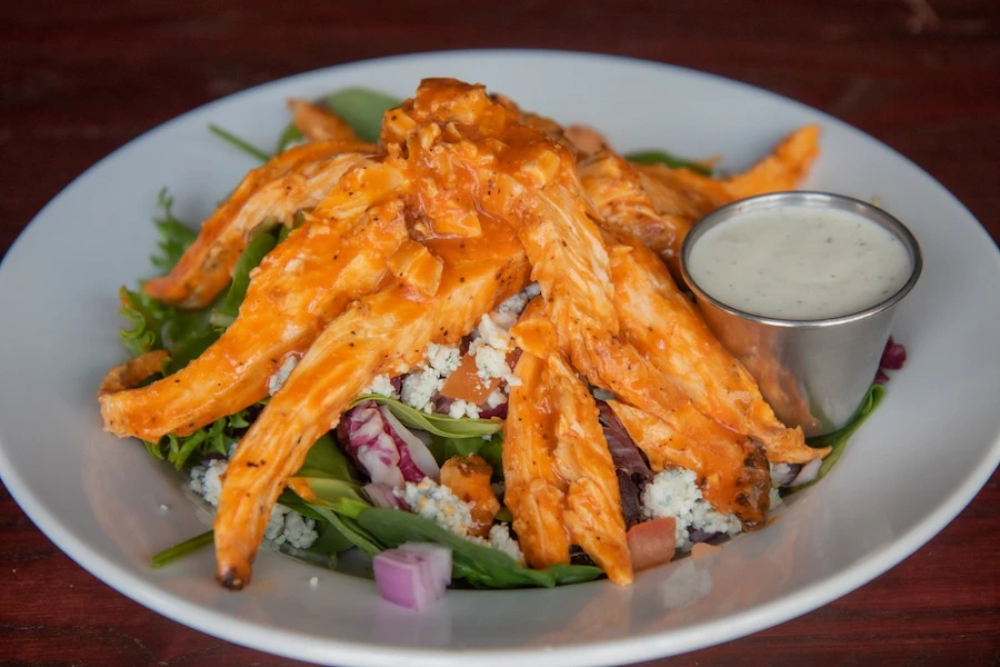 Grilled chicken tossed in buffalo sauce, mixed greens, blue cheese crumbles, red onion, and tomatoes. Served with side of ranch dressing