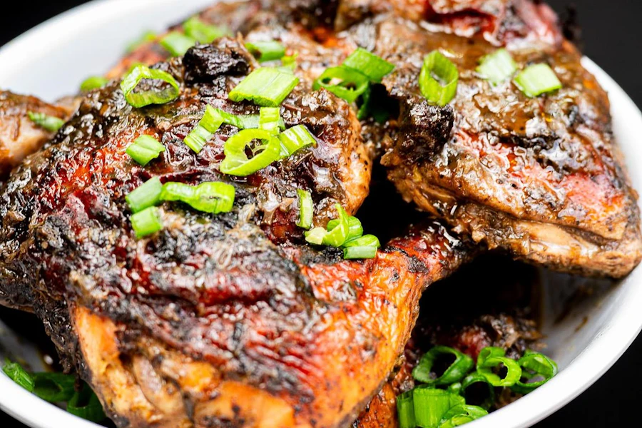 Spicy, smoky jerk-marinated chicken leg quarter grilled to perfection, paired with rice and steamed vegetables. Halal