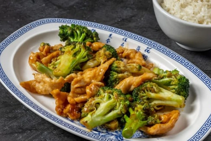 Sliced white meat chicken with broccoli in brown sauce