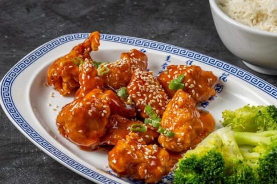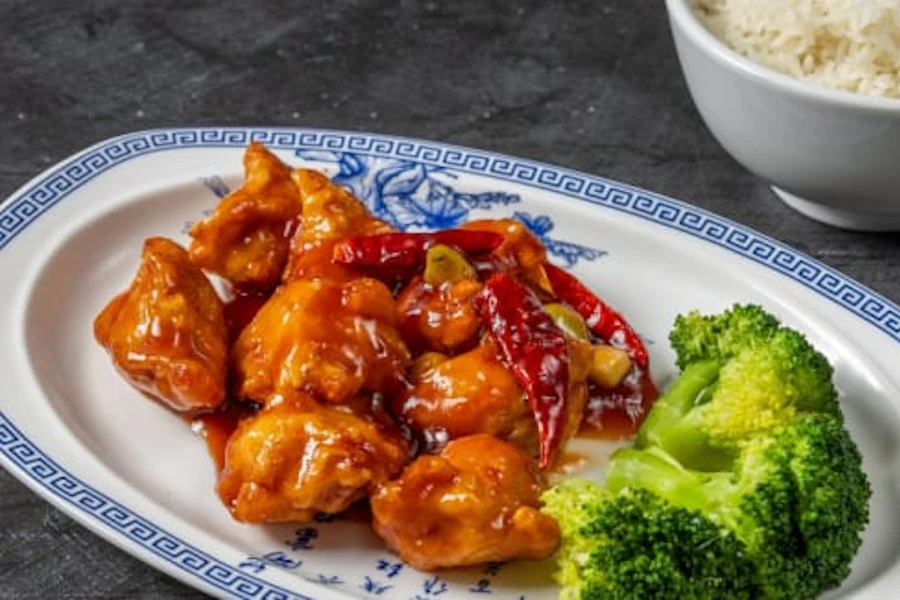 Crispy white meat chicken with general tso's sauce and broccoli, red chili peppers. Slightly spicy