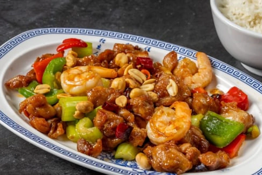 Chicken and shrimp and bell peppers with kung pao sauce. Contains peanuts
