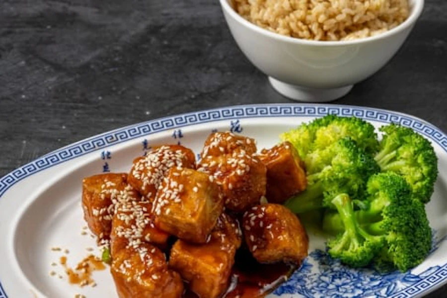 Firm tofu batter coated and fried in sweet and tangy sauce