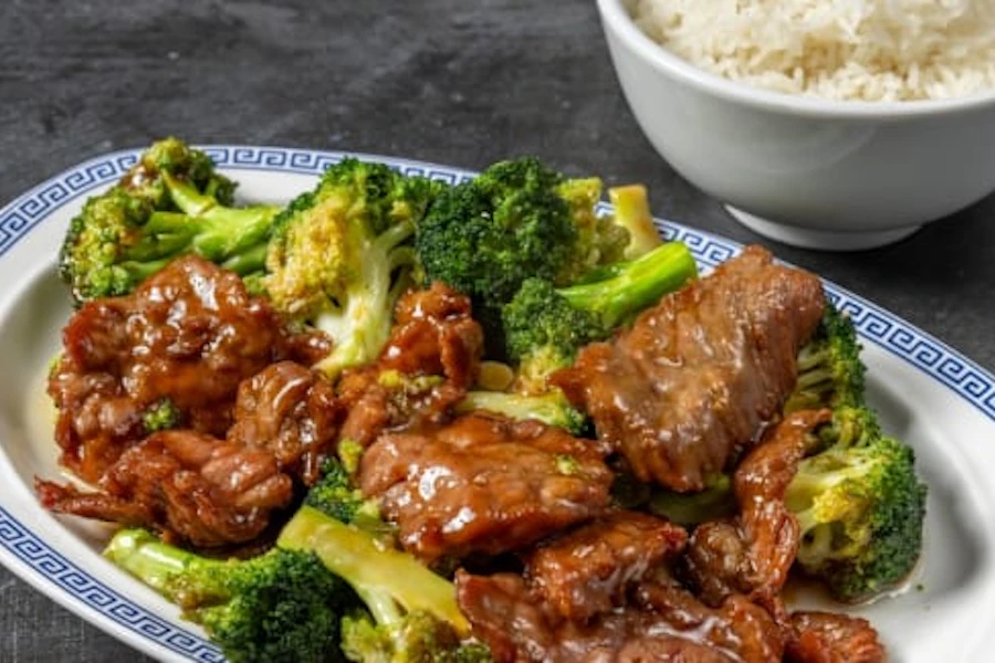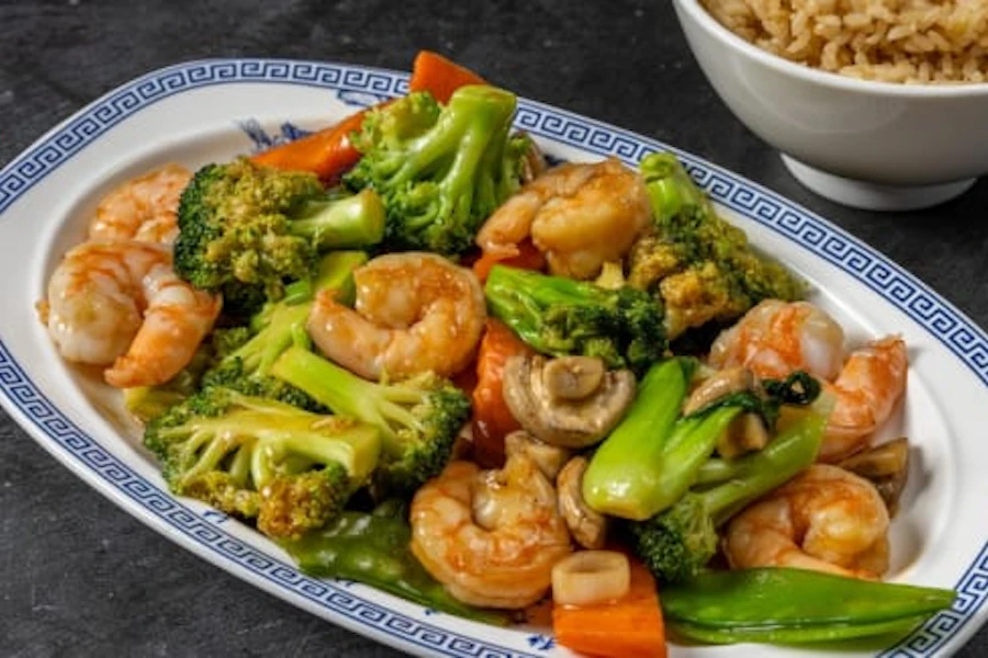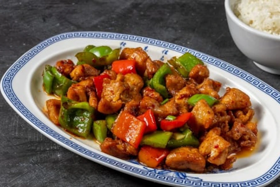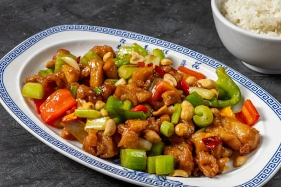 Chicken, shrimp, bell peppers, peanuts, with kung pao sauce