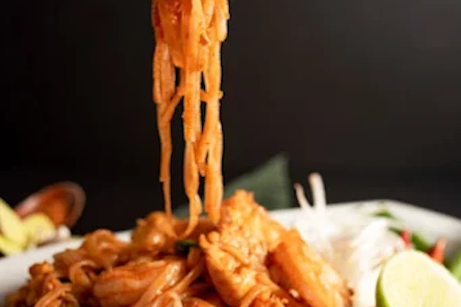 Rice noodles with shrimp, bean sprouts, scallions, eggs, and pad thai sauce. Served with crushed peanuts and lime