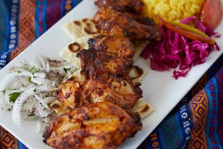 Grilled chicken wings marinated with special kurdish spices served with rice grilled tomato, hot pepper, red cabbage garnish, and onions