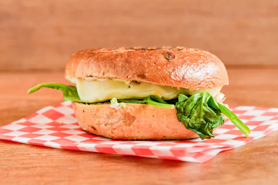 Served hot off the panini grill. Sun-dried tomato bagel, with eggs, garden veggie cream cheese, fresh spinach, and provolone cheese