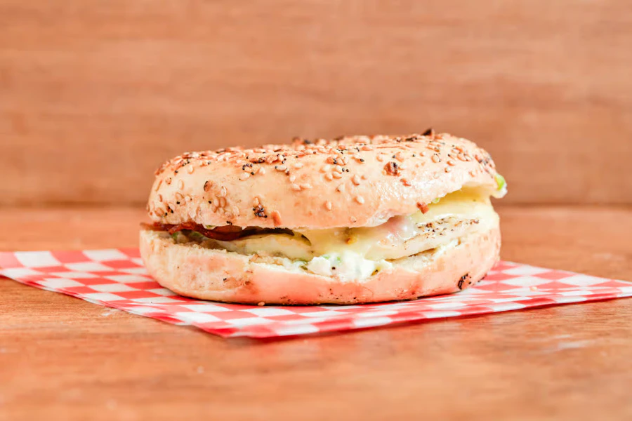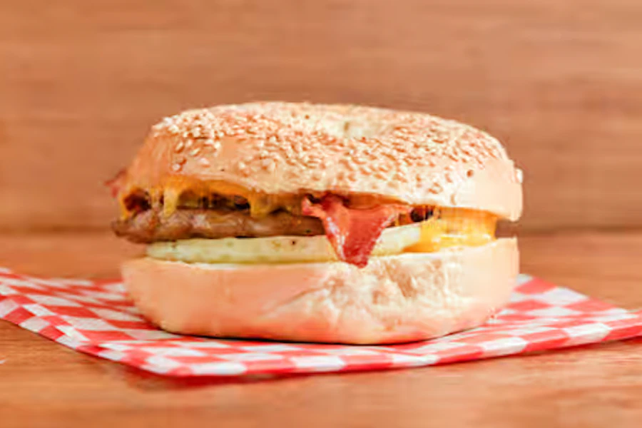 Served hot off the panini grill. Sesame seed bagel with eggs, bacon, sausage, and cheddar cheese