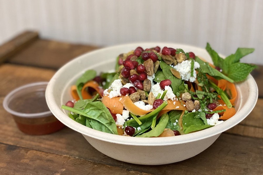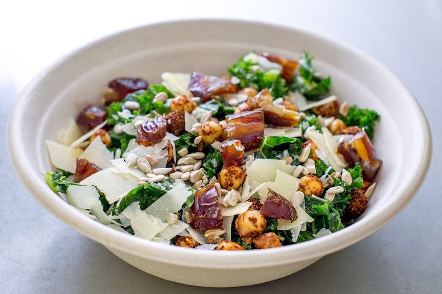 Chopped kale, medjool dates, parmesan flakes, spiced chickpeas, sunflower seeds, dressed with chili infused olive oil
