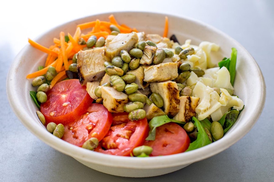 Grilled chicken breast over fresh greens, heart of palm, grated carrots, roasted edamame, tomatoes, side of dressing