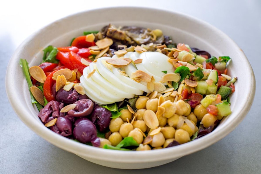 Avocado on fresh mixed greens, middle eastern chopped salad, hard boiled egg, fire roasted red peppers, eggplant, kalamata olives, roasted almond flakes, chickpeas, side of tahini and pita (pita is not gluten-free)
