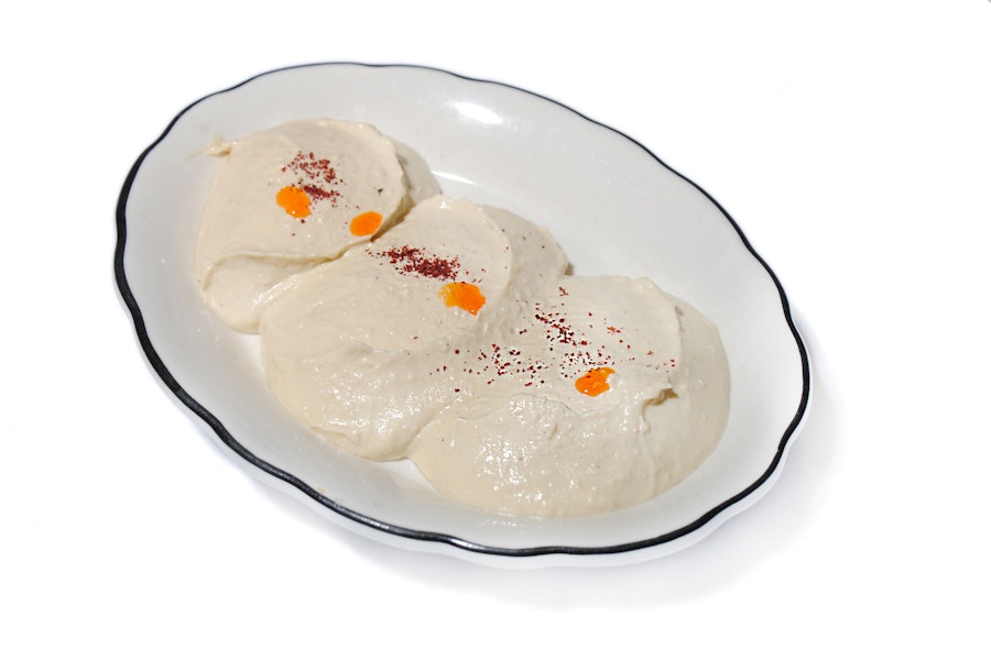 Olive oil, lemon, char-grilled eggplant puree with tahini, garlic