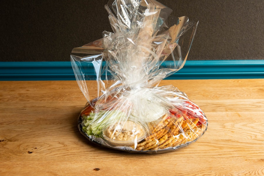 An assortment of Pi Bakerie's signature dips, including tzatziki, hummus, and eggplant dip, served with baked pita and crudités.