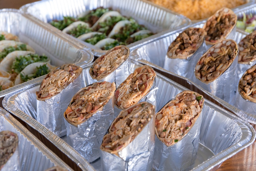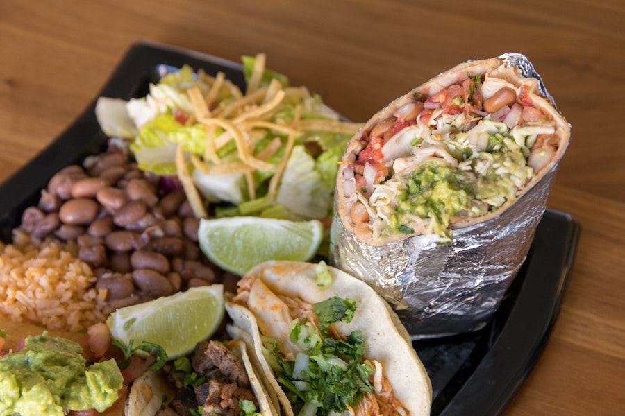 Pinto beans, cheese, pico de gallo, cabbage, red onions, rice, sour cream, & guacamole