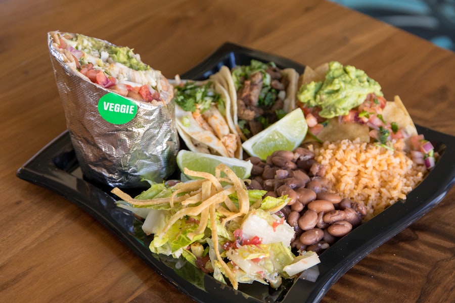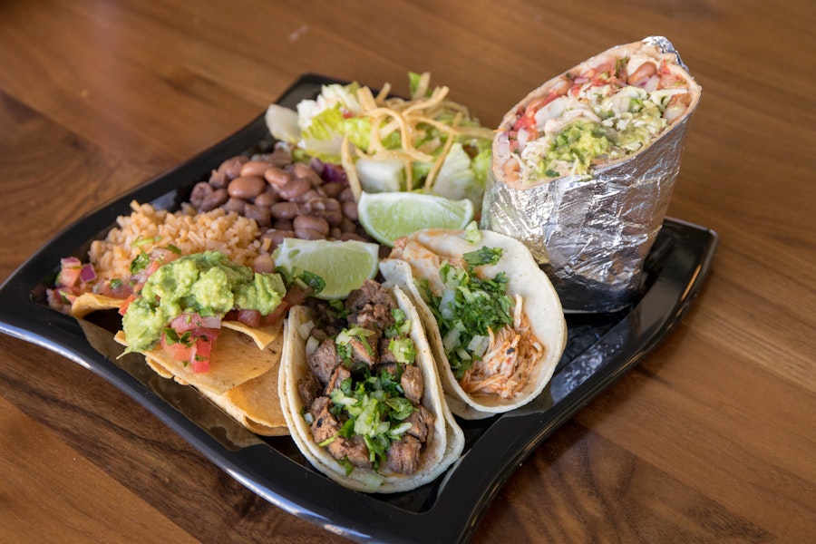 Beans, carne asada, pico de gallo, rice, sour cream, & guacamole