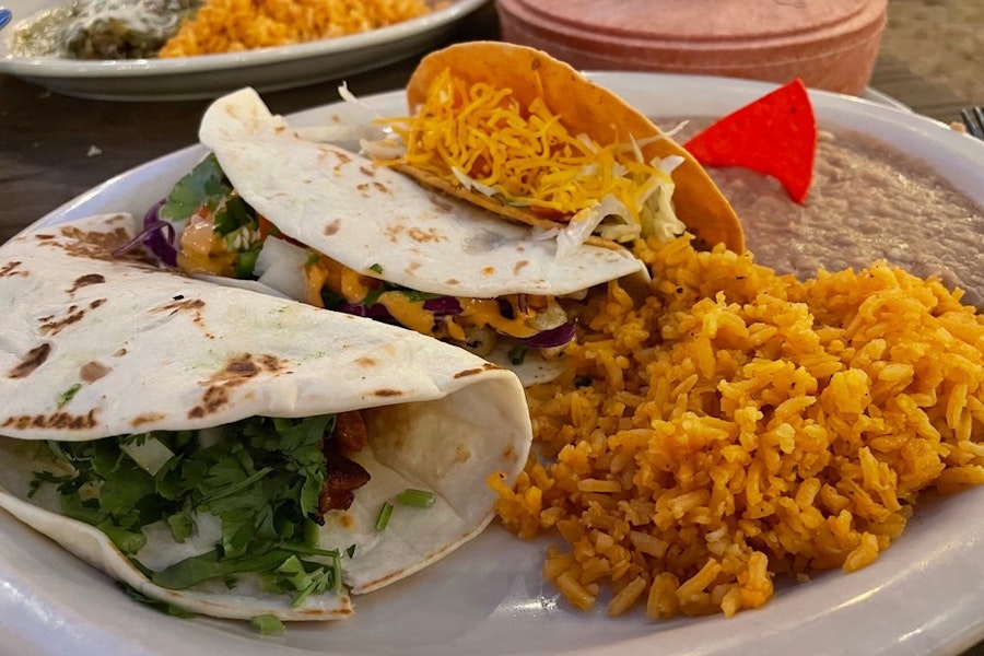 All tacos are made with corn tortillas, served with Mexican rice (contains chicken product) and your choice of beans