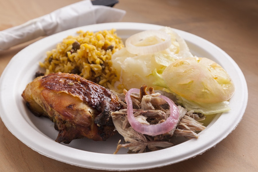 Variation of fried chicken, fried pork, smoked pork chops, spanish sausage, fried cheese, tostones, and french fries with lime slices and mayo-ketchup aioli