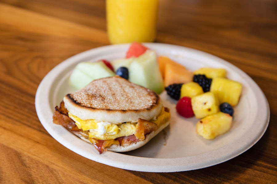 Scrambled eggs, cheddar & turkey sausage on a gluten-free english muffin