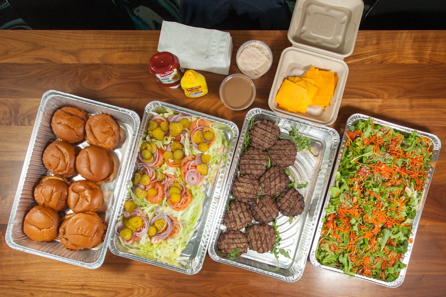 Everything you need to build the burger of your dreams: charbroiled angus beef burgers, toppings and condiments, plus a fresh salad on the side. Premium toppings are available as add-ons!