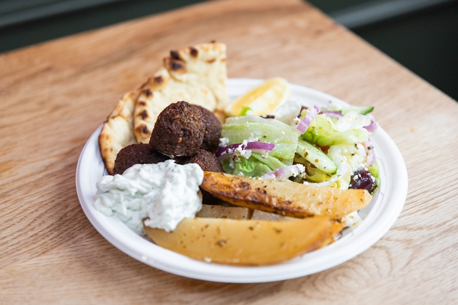 Plant-based (contains gluten) with tzatziki (tzatziki not vegan)
