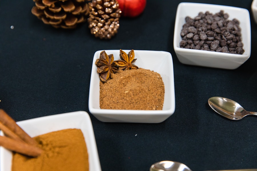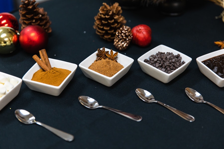 Comes with marshmallows, cinnamon, nutmeg, chocolate chips, and whipped cream