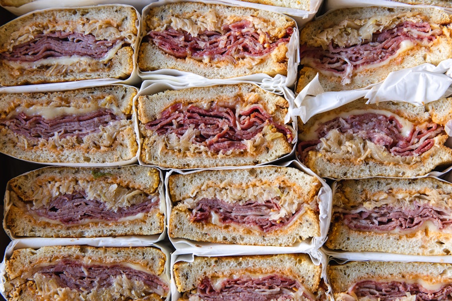 Corned beef, swiss, sauerkraut, and russian dressing on rye bread