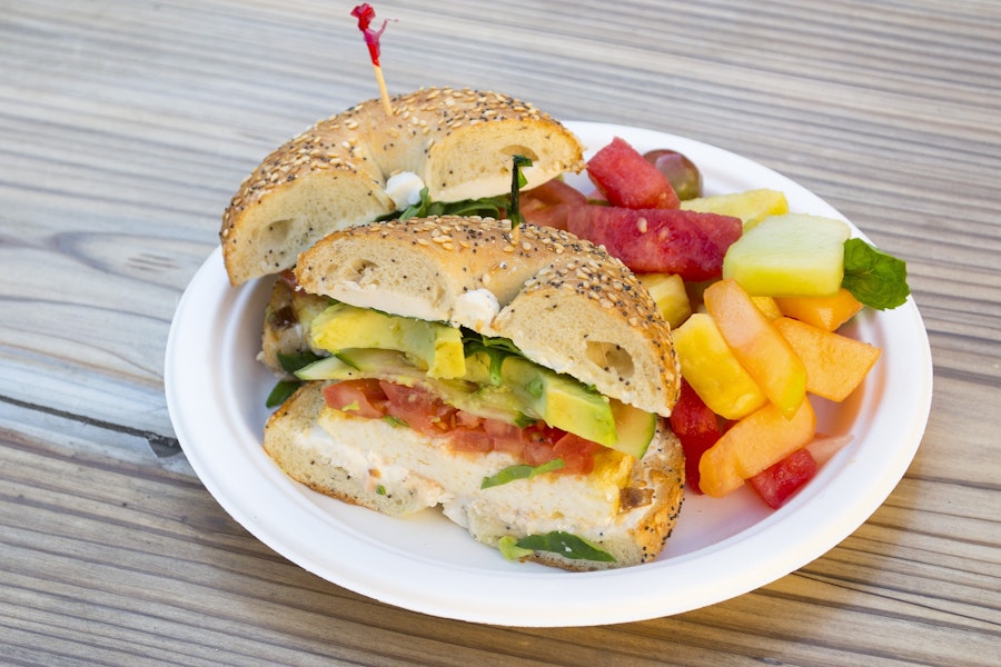 Cream cheese, egg whites, tomato, avocado, cucumbers, red onions, and baby spinach on a gluten-free bagel